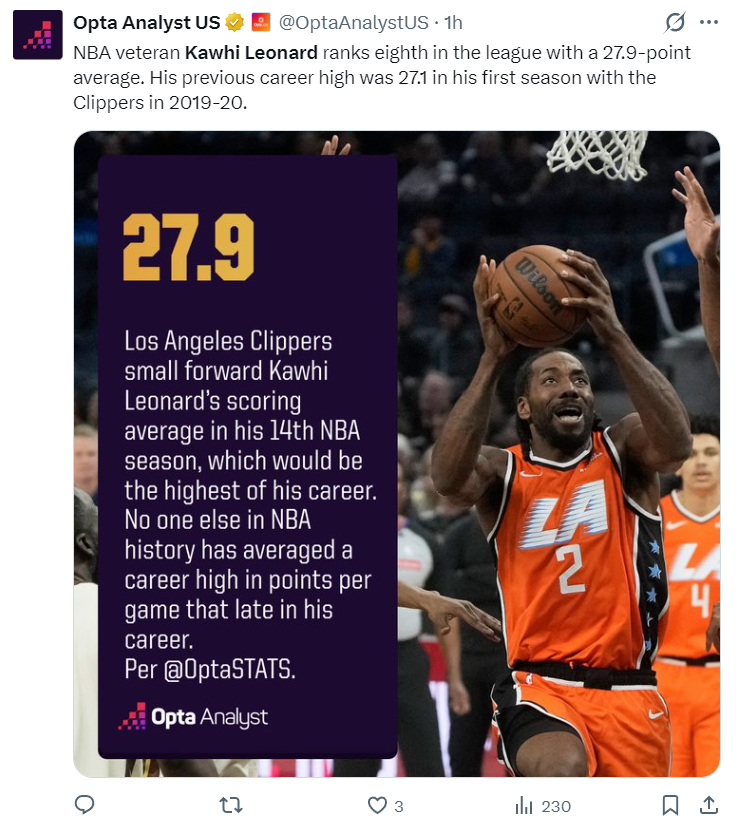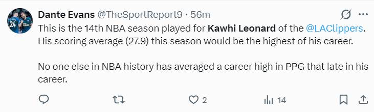 美记DanteEvans写道:伦纳德在职业生涯第14个赛季拿到场均27.9分创造生涯新高,这是NBA历史上首位在生涯第14个赛季拿到场均最高分的纪录,前无古人。